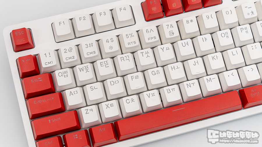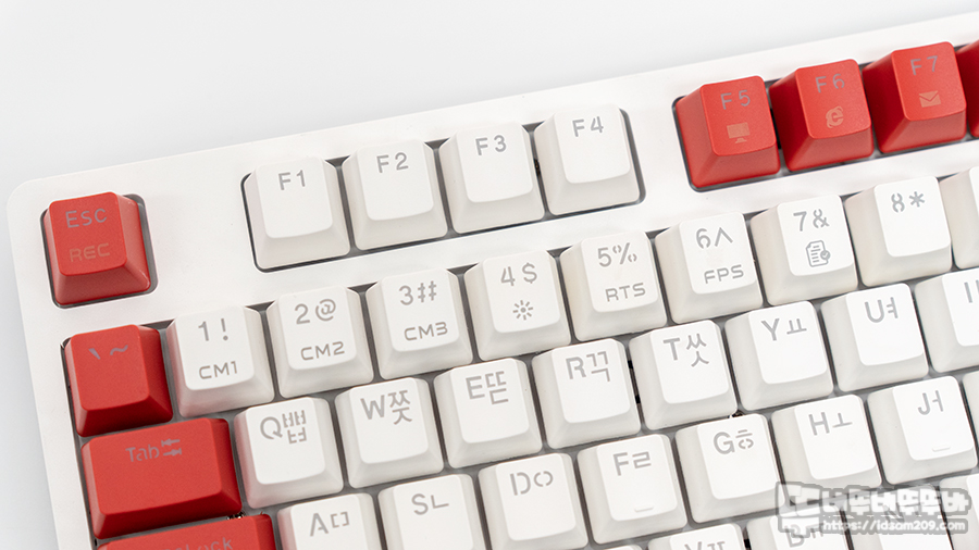 PBT 이중 사출이 적용된 키캡은 각인 부분에 LED 빛이 투과될 수 있게 디자인되어서 그런지 각인이 굵게 보이는 게 특징입니다.