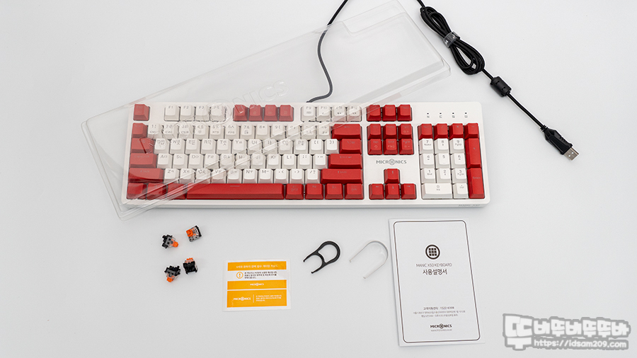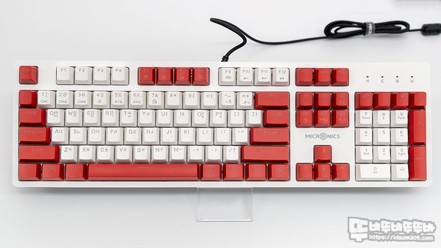 필자가 리뷰하는 마이크로닉스 MANIC X50 키보드는 화이트 컬러의 문자열과 레드 컬러의 모디 열의 투톤 배합으로 디자인된 제품인데요.