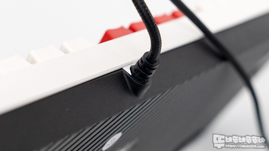 일체형 케이블이 적용된 키보드 상단에는 케이블 꺾임을 방지하는 두툼한 몰딩과 직조 재질의 케이블에는 페라이트 코어와 케이블 정리를 도와주는 벨크로 타이, USB-A 단자를 확인할 수 있습니다.