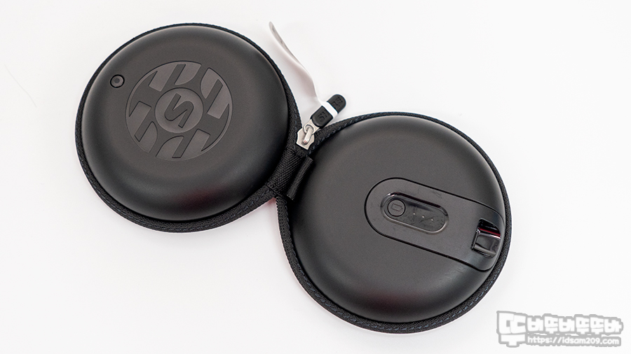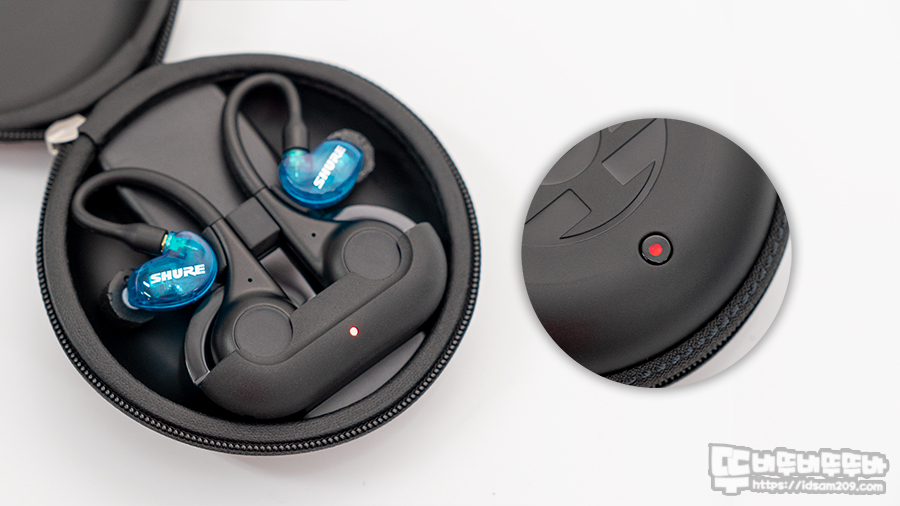슈어 AONIC 215 TW2 블루투스 이어폰 2세대 충전 케이스는 원형의 파우치 느낌의 디자인으로 독특한 느낌을 줍니다.
