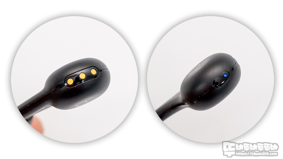 RMCE-BT 무선 아답터 끝부분에는 충전을 위 금속 단자와 전화 통화용 마이크 그리고 작동상태를 알려주는 LED 인디케이터를 확인할 수 있는데 블루투스 이어폰이 오버이어 방식으로 착용되기에 LED 인디케이터를 확인하는 건 쉽지 않은 편입니다.