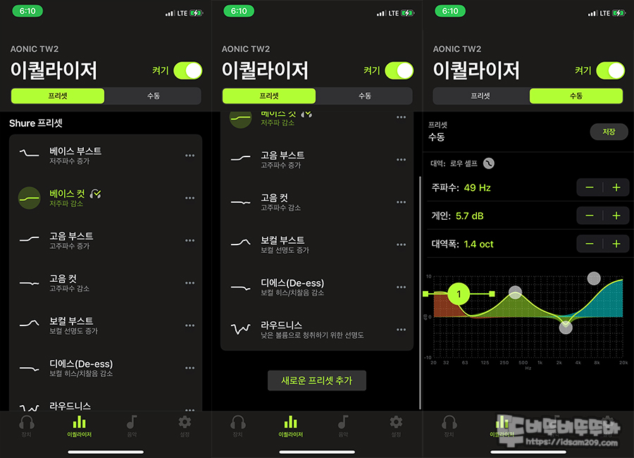 4 밴드 설정 시 단순하게 위/아래로 올리고 내리는 설정 및 커브를 이용한 각도 조절을 통해 섬세한 설정이 가능하니 취향에 맞는 이퀄라이저를 세팅하여 사용하는 것도 슈어 AONIC 215 TW2 블루투스 이어폰 2세대의 매력이 아닌가 싶네요.
