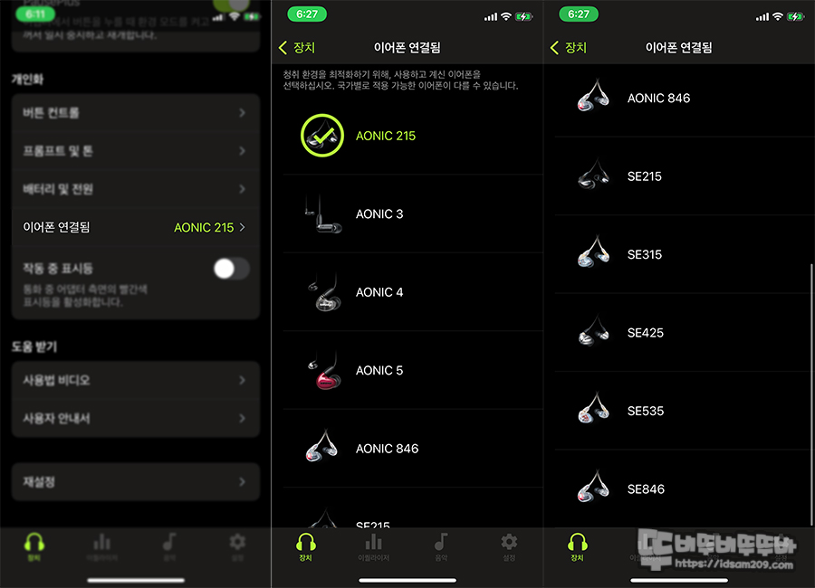 이어폰 연결 부분은 자동으로 감지되어 연결되기에 특별히 선택할 건 없지만, 다양한 AONIC / SE 시리즈 이어폰을 사용할 수 있어 보였습니다.
