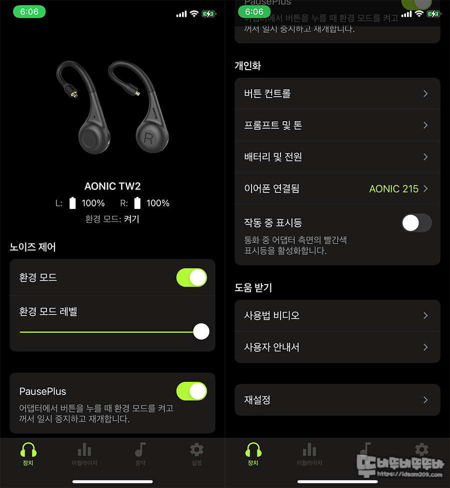 PausePlus 활성화 시 음악이 멈추면 외부 소리를 듣는 환경 모드가 자동으로 실행되는 설정이 가능합니다.