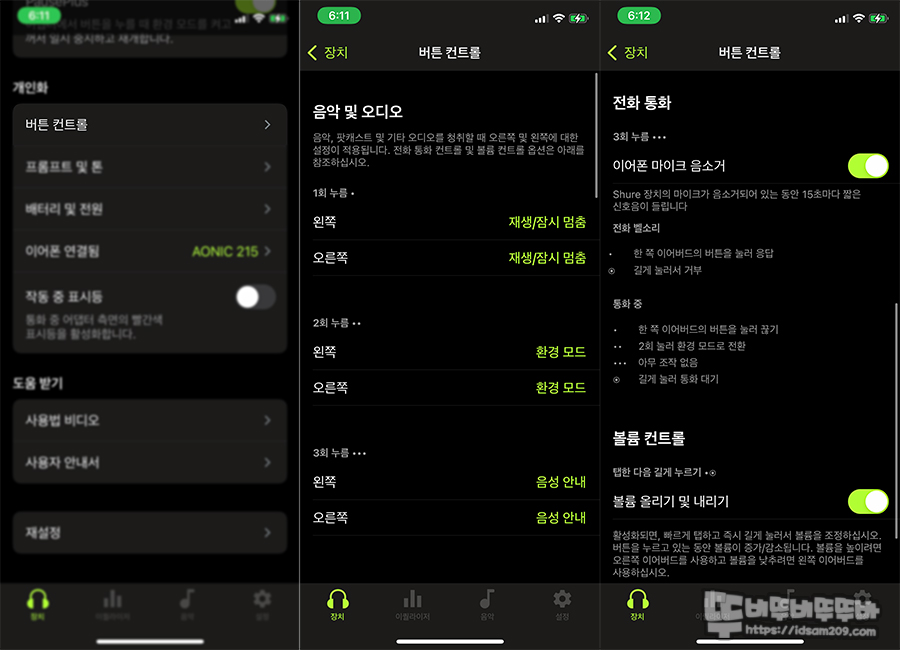 슈어 AONIC 215 TW2 블루투스 이어폰 2세대의 버튼 컨트롤 기능은 전용 앱을 이용하여 변경이 가능하지만 기본적인 컨트롤 기능을 살펴보면..