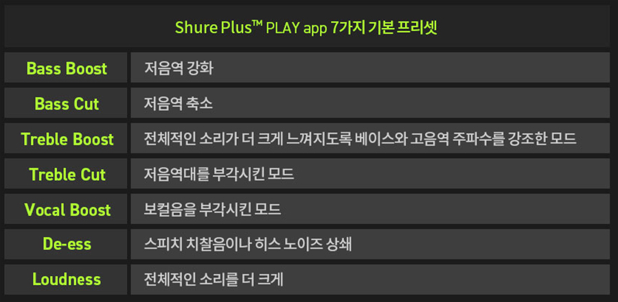 앱 메뉴 하단에 이퀄라이저 선택 시 기본 7가지 이퀄라이저 프리셋을 사용할 수 있으며, 수동 프리셋 또는 새로운 프리셋 추가 시 4 Band EQ -10~+10dB 범위 내의 커스터마이징 설정이 가능합니다.