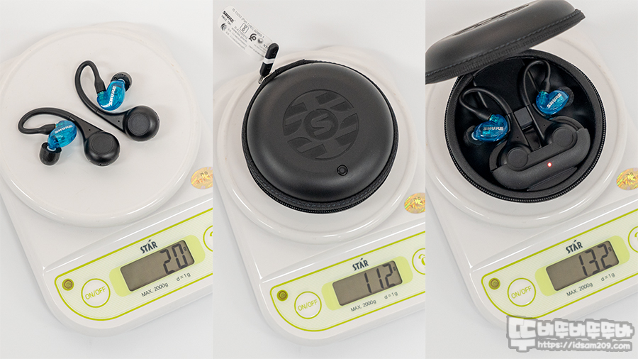 1g 단위로 측정 가능한 디지털 저울로 무게 확인 시 이어버드는 약 20g, 충전 케이스는 약 112g, 무선 이어버드와 충전 케이스를 더한 무게는 약 132g으로 확인됩니다.