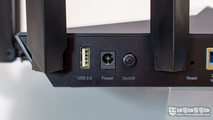 제품의 포트 부분을 살펴보면 공유기 우측면에 위치한 USB 3.0 포트 그리고 후면의 USB 2.0 포트를 지원하여 외장 HDD와 USB 메모리를 이용한 스토리지 기능을 지원하고요.