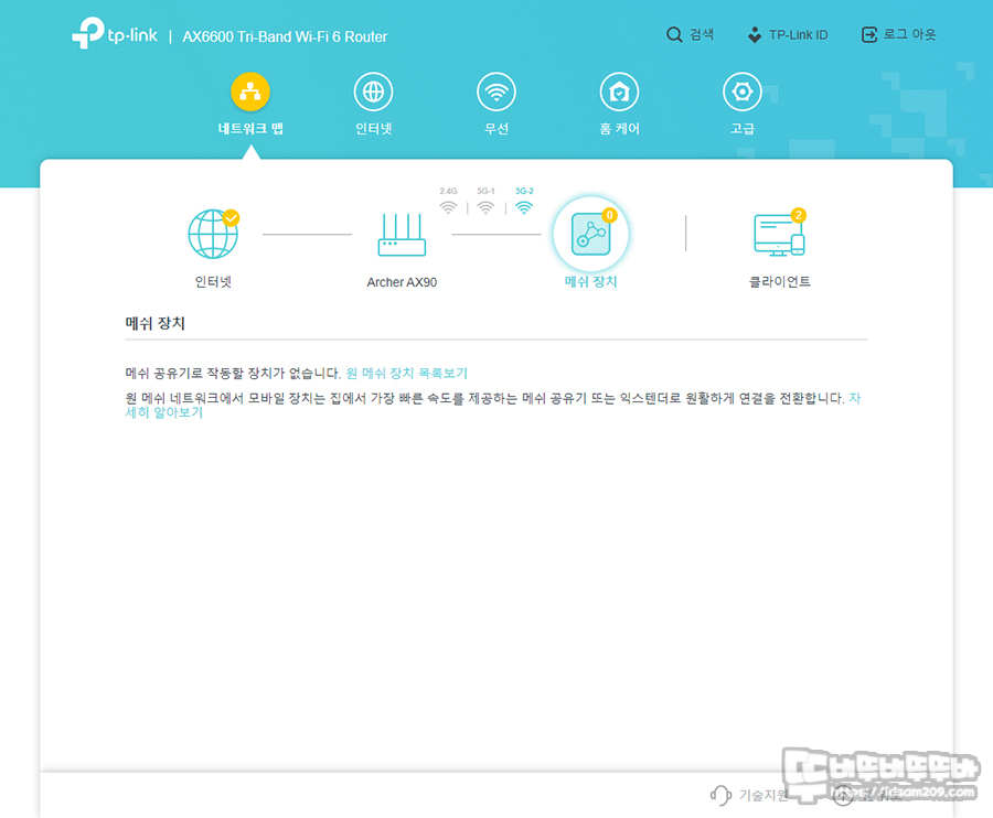 네트워크 맴 메뉴를 통해서 인터넷 / 공유기 상태 / 메시 장치 / 공유기에 연결된 유무선 장치 등 가장 기본적인 정보를 직관적으로 확인할 수 있습니다.
