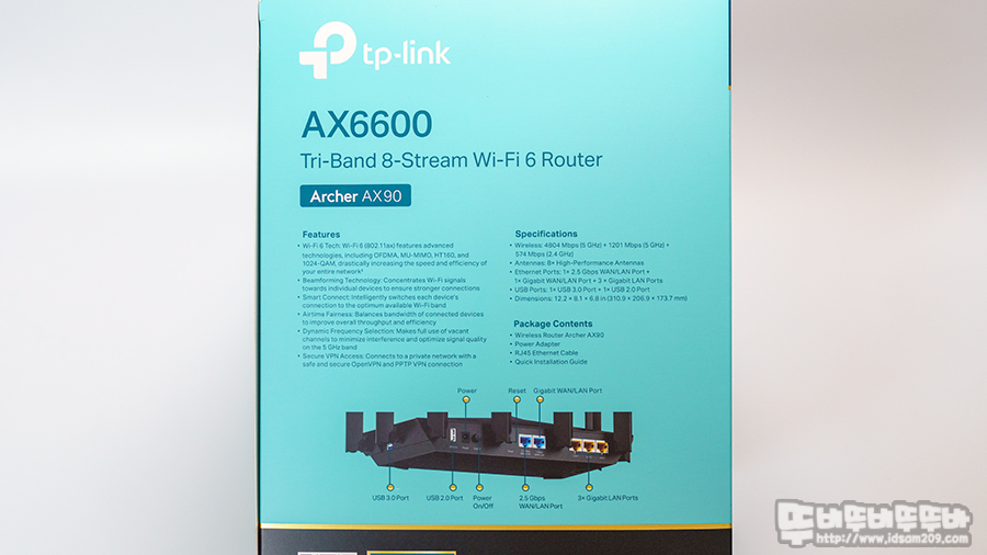 패키지에서는 tp-lin 로고와 제품의 특징인 AX6600 속도 Tri-Band, 8 스트림, Wi-Fi 6 지원 그리고 모델명 Archer AX90 그리고 2.5Gbps 지원 등 제품의 특징을 살펴볼 수 있고요.