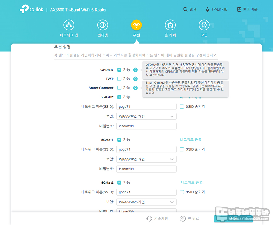 무선 연결에서는 OFDMA, TWT, Smart Connect 등 필요에 의한 V표 체크를 해주어야 하며 네트워크 상태에 따라 자동으로 무선인터넷 속도를 변경해 주는 Smart Connect을 사용하시면 하나의 SSID로 편리하게 사용할 수 있기에 강력하게 추천드립니다.