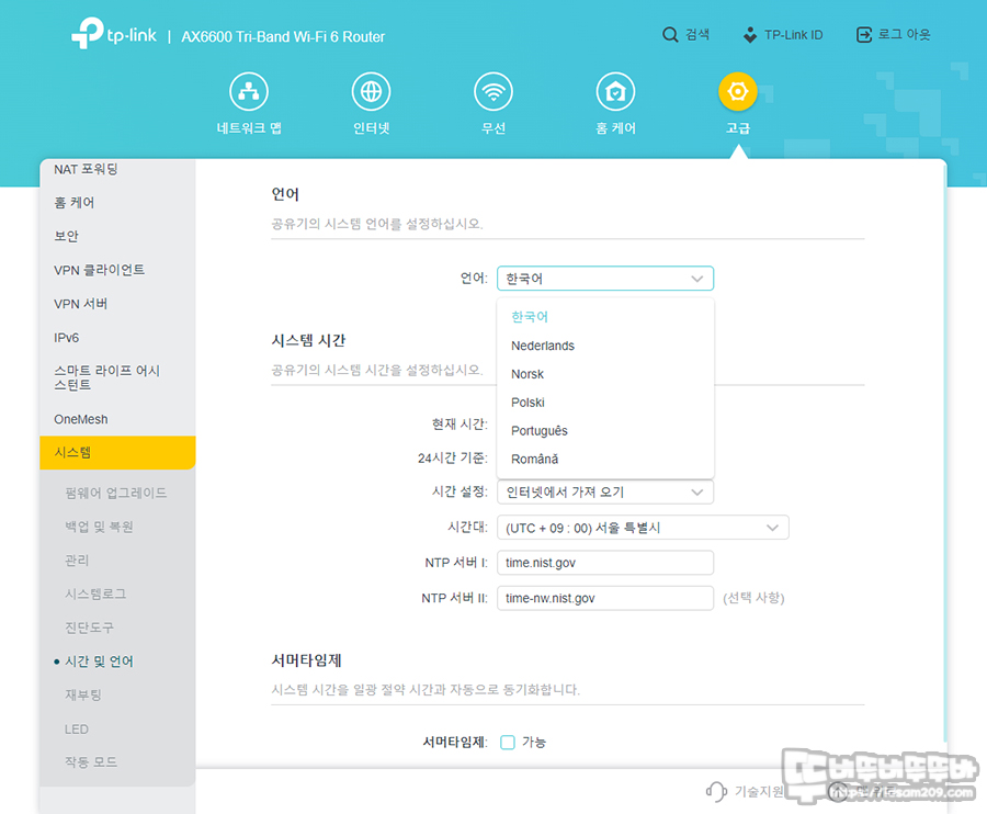 관리자 메뉴 접속 시 가장 먼저 체크해 줘야 하는 부분이 고급 메뉴에 있는데 바로 메뉴를 한글로 볼 수 있게 해주는 공유기 언어 설정입니다.