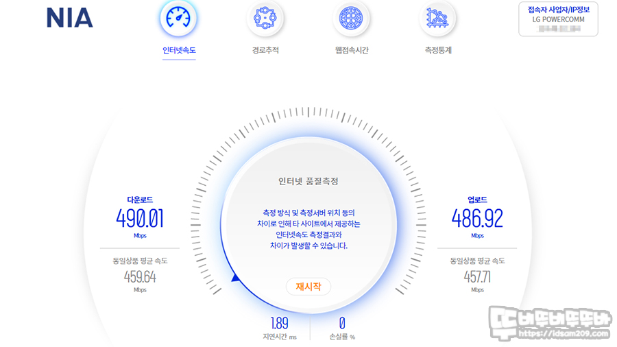 필자는 LG U+의 기가 슬림 서비스를 사용 중이며 유선 속도는 기가 슬림 속도인 500Mbps에 준하는 속도를 보여주었습니다.