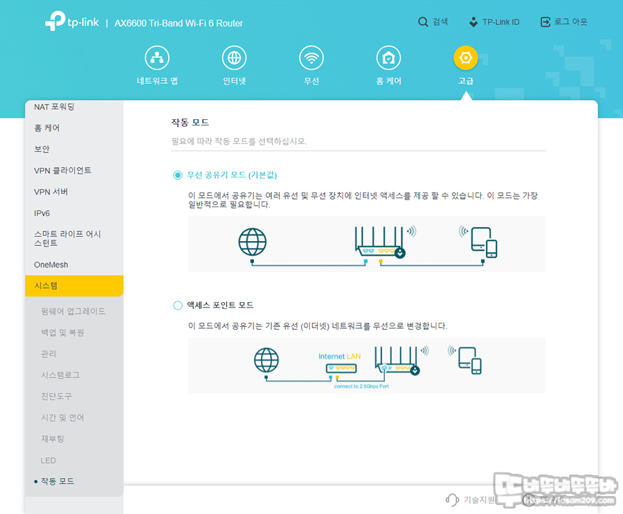 작동 모드에서는 무선 공유기 모드로 유무선 인터넷 사용 또는 공유기나 모뎀에 추가하여 무선 인터넷만 사용하게 되는 액세스 포인트 모드를 지원하기에 환경에 맞는 사용이 가능합니다.
