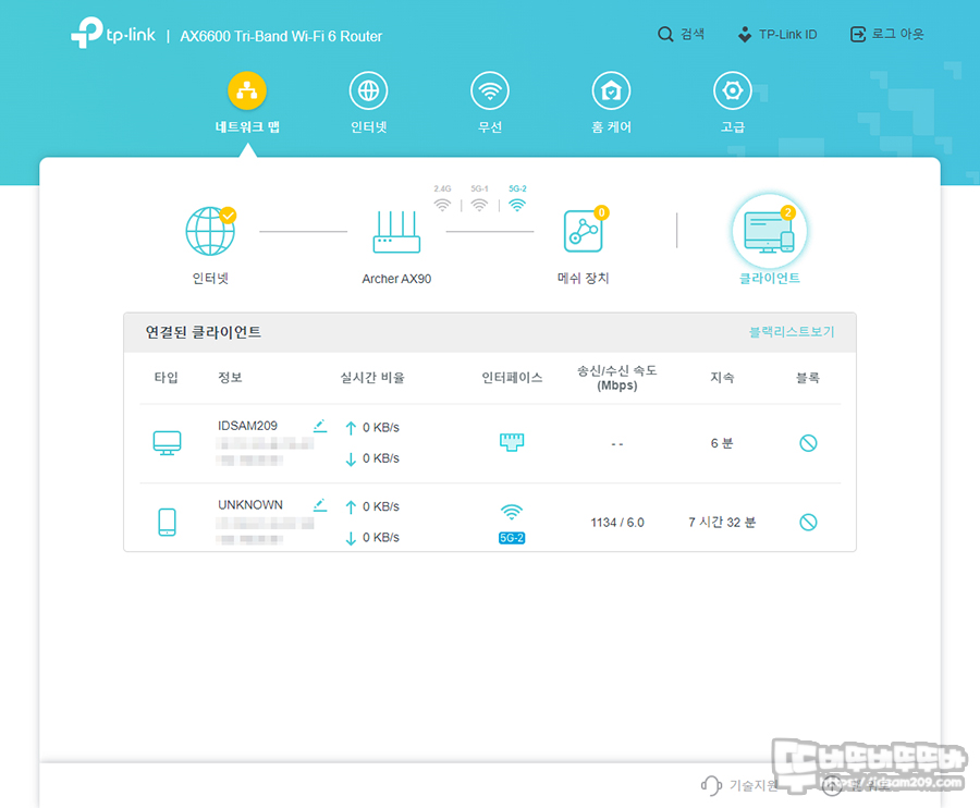 클라이언트 메뉴에서는 LAN 포트와 와이파이 아이콘으로 연결된 장치 정보를 보여주어 연결된 장치 정보를 빠르게 확인할 수 있었습니다.