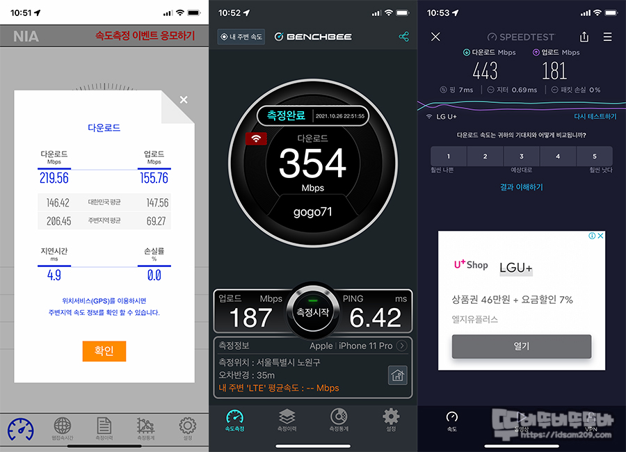 5GHz SSID 접속 후 속도 테스트 시 공유기 주변, 공유기에서 떨어진 곳, 다수의 기기 연결로 속도를 비교 시 통신사 공유기보다 빠르고 안정적인 속도를 보여주었습니다.