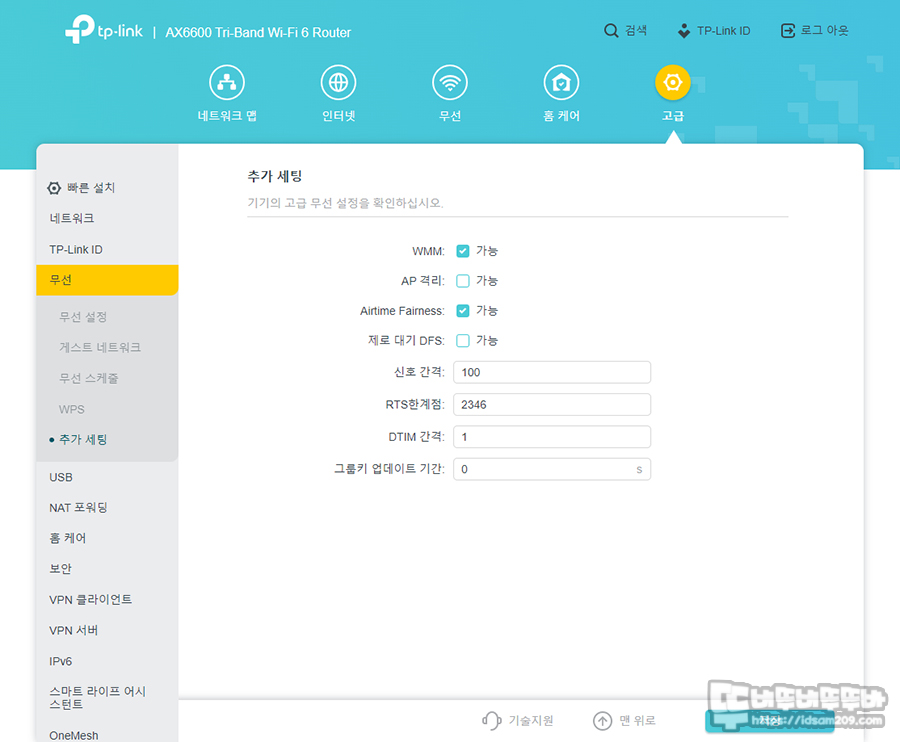 무선 메뉴에서는 특정 무선 기기에 신호가 치우치지 않고 않도록 접속한 무선 기기의 균등한 속도를 지원하는 Airtime Fairness 기능 활성화하는 메뉴가 있으니 참고하시면 좋을 거 같습니다.