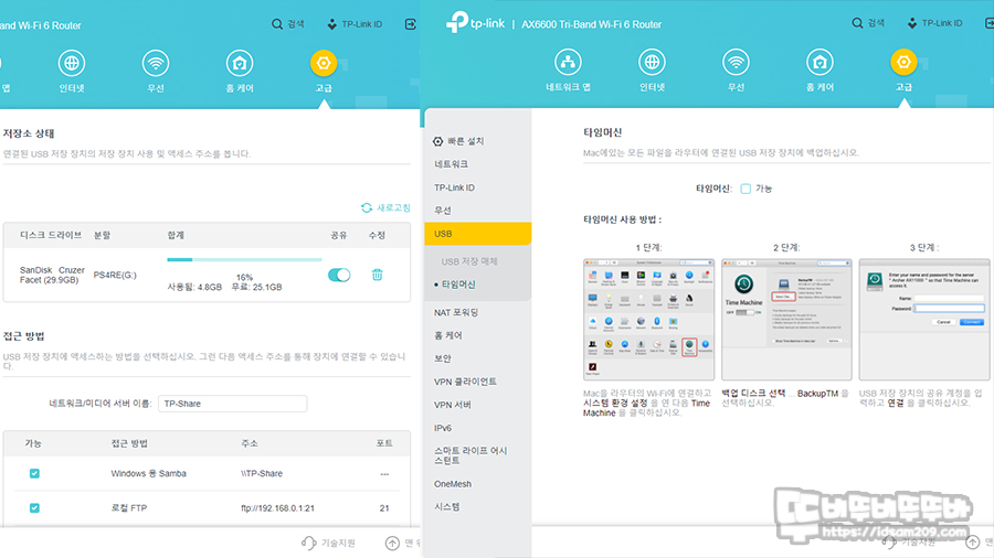 이렇게 연결된 장지는 SAMBA 또는 FTP 형태로 파일 전송과 공유 그리고 맥 OS의 타임머신 기능을 지원하니 필요에 따라 잘 활용하시기 바랍니다.