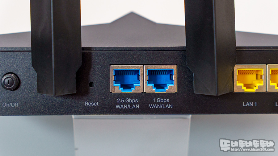 USB 2.0 포트 옆으로는 전원 소켓 / 전원 스위치 그리고 리셋 스위치와 2.5Gbps / 1Gbps WAN 또는 LAN 겸용 포트 그리고 1Gbps LAN 포트 3개로 구성되어 있습니다.