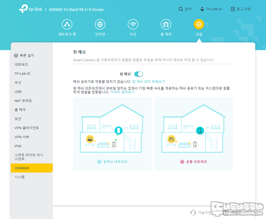 그밖에 동일 브랜드 제품 메쉬 공유기 또는 익스텐더를 이용한 원 메쉬 설정 메뉴에서는 원 메쉬 활성화 후 화면에서 알려주는 대로 설정을 진행하시면 되시고요.