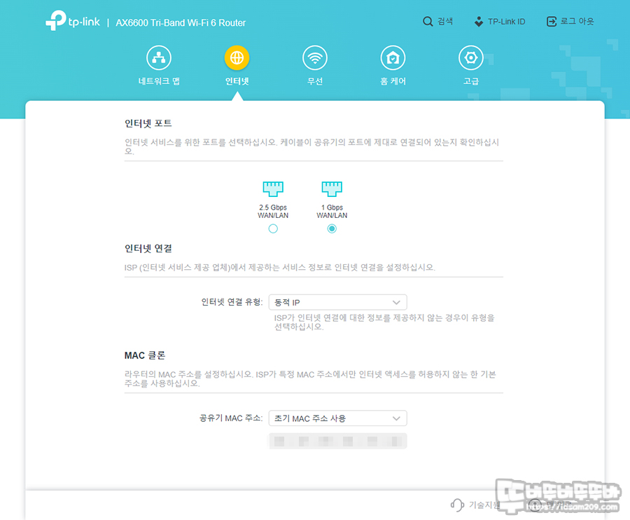 인터넷 메뉴에서는 인터넷 서비스 연결에 대한 선택을 하는 메뉴가 있어 WAN/LAN 포트에 연결된 내용을 관리자 메뉴에서 체크해 주는 이중 체크 구성을 확인할 수 있었습니다.