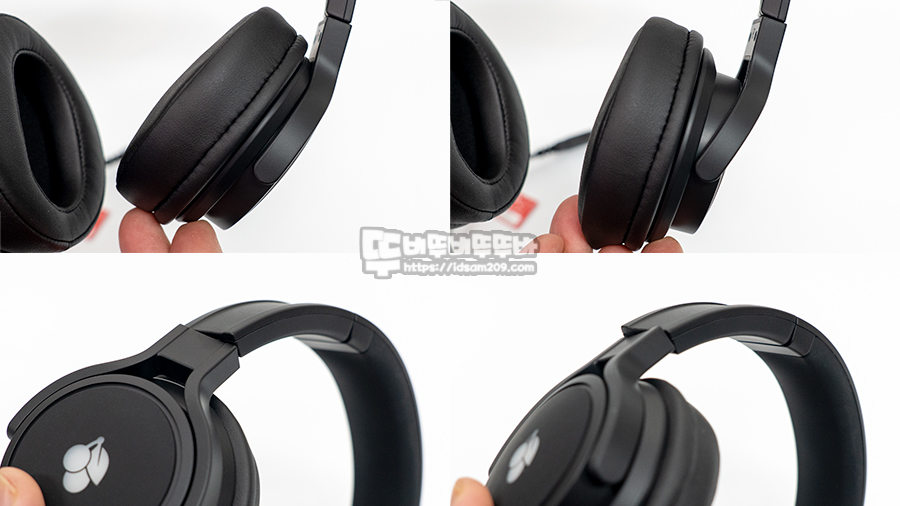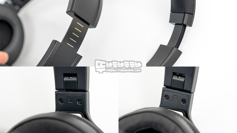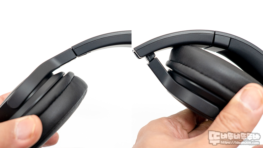 길이 조절 부위 아랫부분은 폴딩 방식 디자인 적용과 스피커 하우징을 잡아주는 C 포크 부분의 틸트와 약간의 좌우 스위블 지원으로 다양한 각도를 제공하여 최적의 착용감을 만들어줍니다.
