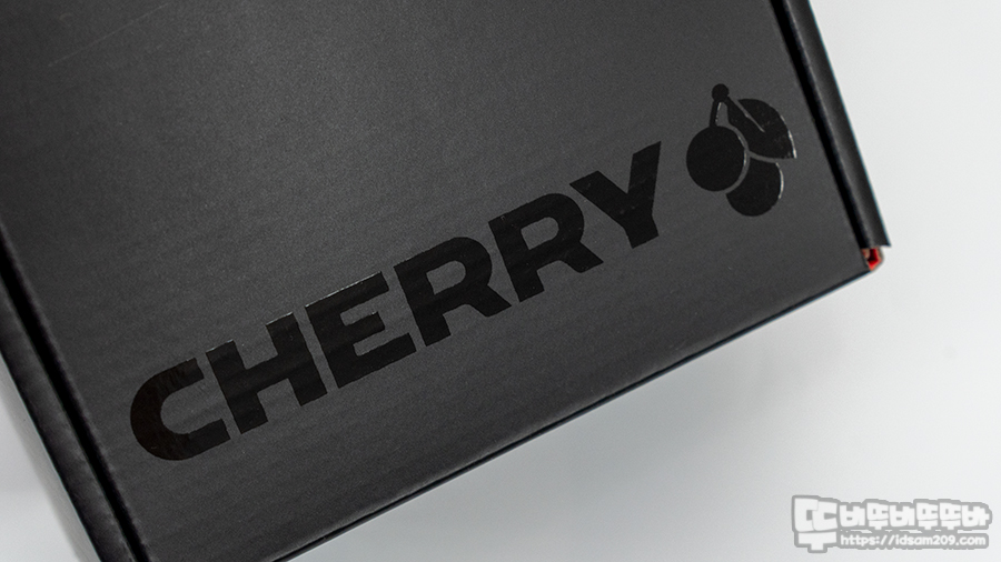전면에 유일하게 컬러 느낌을 주는 유통사 (주)피씨디렉트의 정품 인증 스티커 모습과 아랫부분에 유광 느낌의 체리 로고 모습.