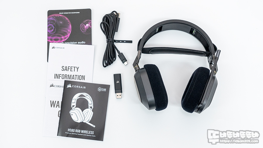 제품은 HS80 RGB 무선 게임용 헤드셋 본체, 무선 USB 어댑터, USB 충전 케이블(1.5m), 빠른 시작 가이드, 안전 리플렛, 보증서로 구성되어있습니다.