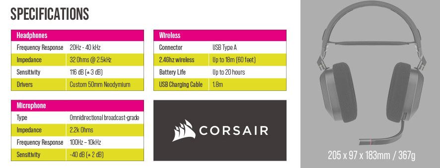 유무선 사용을 지원하는 커세어 HS80 RGB WIRELESS 게이밍 헤드셋은 전원을 켜지 않은 상태에서 USB-C to A 케이블로 컴퓨터에 연결 시 24비트/96KHz의 고음질 지원하며 무선으로 연결 시 24비트/48KHz 사운드를 지원하는데요.