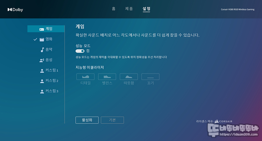 커세어 HS80 RGB WIRELESS 게이밍 헤드셋의 iCUE에서는 가상 7.1채널 사운드 설정 메뉴가 없어 게이밍 헤드셋치고 뭔가 사운드가 부족한 게 아닌가? 싶었는데 향상된 돌비 애트모스 지원으로 제품의 사운드 퀄리티는 보완하고 있으며 유료 상품인 돌비 애트모스를 무료로 사용할 수 있어서 좋았습니다.