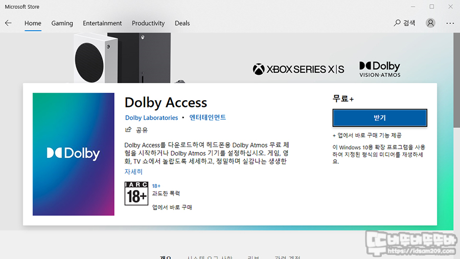 MS 스토어에서 Dolby Access 받기를 통해 다운받으시면 되는데요. 이미지에 표기한 대로 무료입니다.