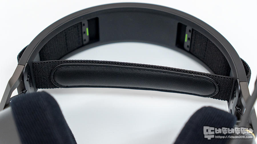 통기성이 좋은 천 원단의 플로팅 헤드밴드는 탄력이 있는 편이며 정수리에 닿는 안쪽 면에 쿠션을 이용한 쿠션감을 제공하며 고정된 헤어프레임 내부에 밸크로 타이에서 볼 수 있는 돌기 면과 밴드 끝부분에는 접착되는 부드러운 면으로 디자인되어 돌기 면의 범위내에서 밴드의 탄력을 조절하여 헤드셋 착용 시 높이 조절이 가능합니다.