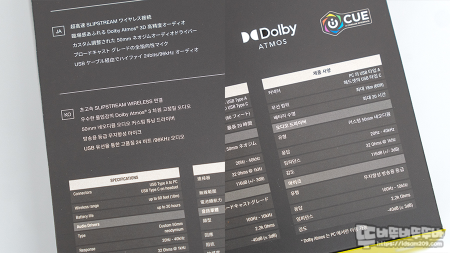 패키지 뒷면의 초고속 SLIPSTREAM 무선 연결, 우수한 몰입감을 주는 돌비 애트모스 입체음향 50mm 드라이버 유닛 사용과 방송용 등급의 무지향성 마이크, USB 연결 시 24비트/96KHz의 고품질 오디오 지원 등의 제품의 특징과 제품 스펙 정보가 인쇄되어 있고요.