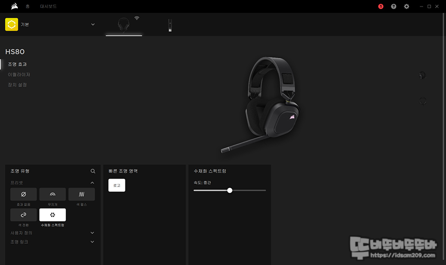 iCUE를 통한 HS80의 소프트웨어 기능은 상당히 심플한 편으로 조명효과 / 이퀄라이저 / 장치 설정으로 구성되었으며 조명효과는 커세어 로고에만 적용되다 보니 크게 눈에 띄지 않는 편입니다.
