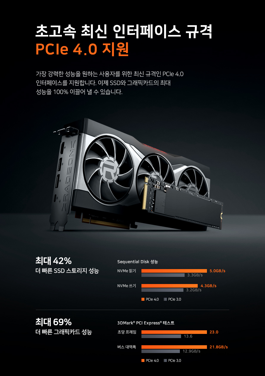 위의 도표와 같이 PCIe 3.0에 비해 속도가 빠른 PCIe 4.0은 M.2 스토리이지의 속도와 그래픽 카드의 처리 속도를 향상시켜 주기에 현재 시점에서 빠른 컴퓨터를 위한 필수 요소가 아닌가 하는 생각이 드네요.