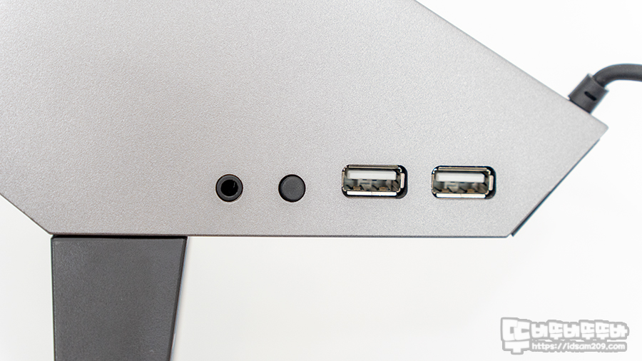 거치대 바닥면과 보조 다리 바닥면에는 미끄럼 방지 패드가 부착되어 있어 미끄러지지 않게 거치가 가능하며 측면에는 3.5mm 사운드 출력 포트 / LED 효과 변경 버튼 / USB 포트 2개로 구성되어 있습니다.
