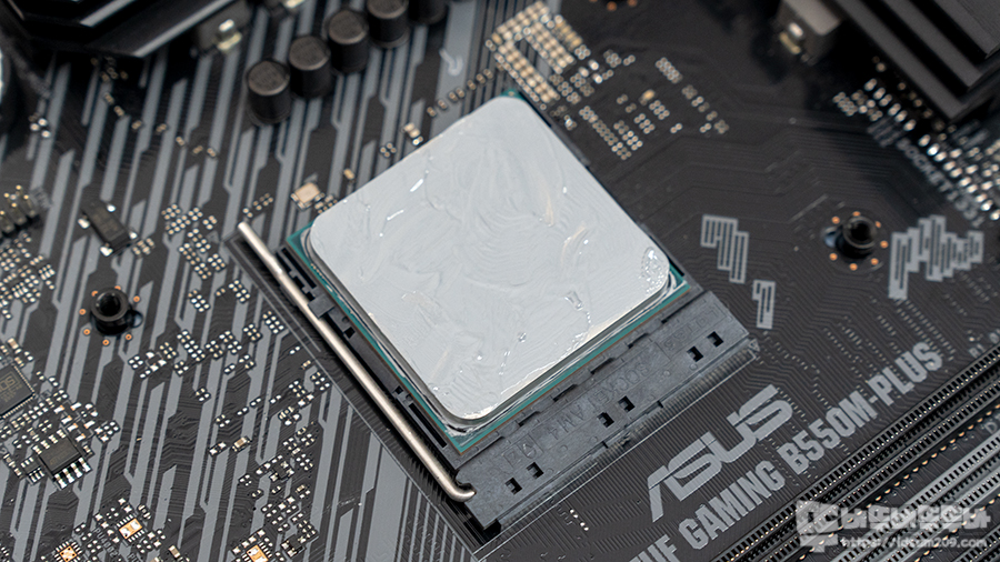골고루 도포한 모습인데요. CPU 쿨러 압력으로 사방으로 퍼질 서멀구리스 느낌을 계산하여 작업을 하였습니다.