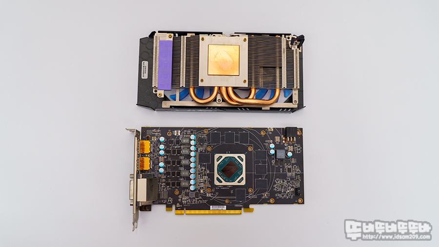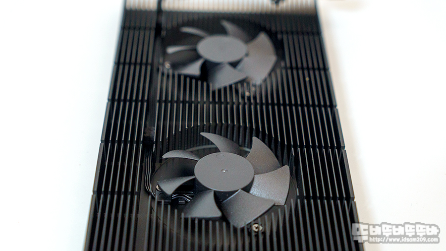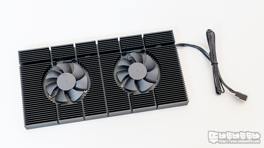 듀얼 쿨링팬이 적용되어 쿨링팬의 바람이 히트싱크로 퍼져 냉각을 하는 구조로 직접 냉각이 아닌 간접 냉각 방식이기에 VGA 백패널에 부착하기 위해서는 제공되는 서멀패드를 부착해야 합니다.