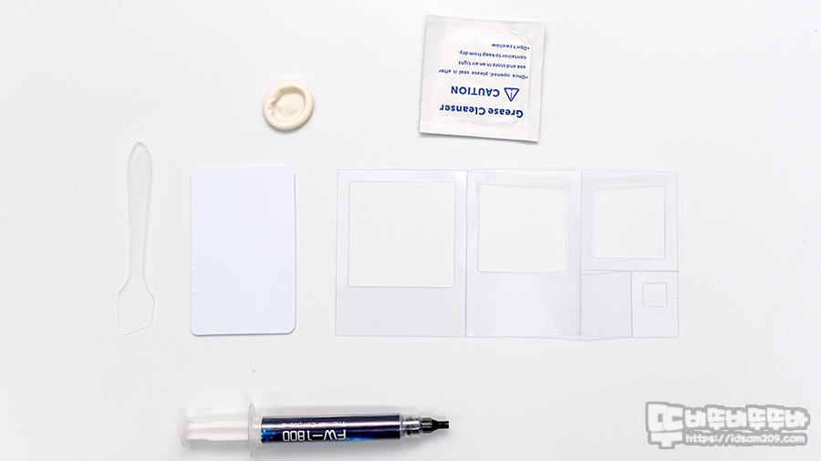 용량 3g에 18Wmk의 열전도율을 가진 제품으로 Frostwind FW-1800 서멀구리스, 스크래퍼, 손가락장갑, 구리스 클리너 페이퍼, 코어별 도포 가이드로 구성이 되어있습니다.