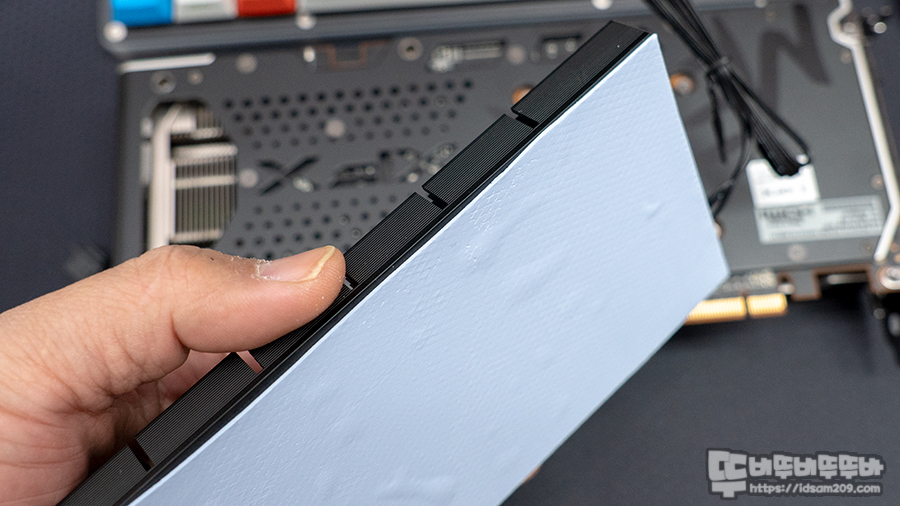 이후 그래픽카드 백패널의 표면을 닦아내고 서멀패드가 부착된 쿨링패드를 올려줍니다.