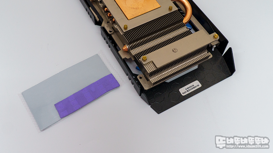 필자가 작업한 그래픽카드의 부착된 보라색 서멀패드는 최신 메인보드 M.2 SSD 방열판에 부착된 서멀패드와 비슷한 약간의 껌 느낌?으로 약간의 두께가 있는 제품이라고 하더라고 결합 시 압력에 의해 늘어나는 성질이 있지만, Zezzio 서멀 패드의 경우 압력에 늘어나는 타입이 아니기에 정확한 두께의 제품을 구입하여 사용해야 합니다.