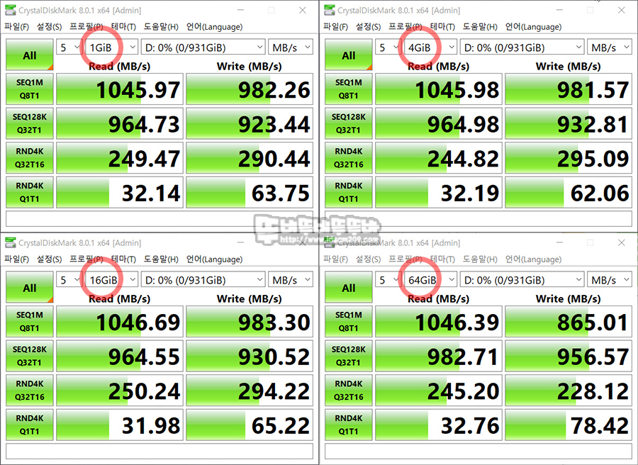 CrystalDiskMark 테스트 시 용량을 변경하여 테스트에서는 읽기 속도는 변함이 없고 쓰기 속도에서 약간의 차이를 확인할 수 있었습니다.