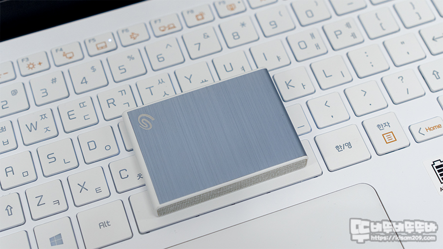 씨게이트 Fast One Touch SSD 데이터복구 (1TB)는 가로 50mm X 세로 70mm X 두께 10.6mm의 플라스틱 베이스에 상단에 고급스러운 느낌의 알루미늄 소재를 사용하고 양쪽 측면에는 부드러운 패브릭 소재를 사용하여 기존의 투박하고 차가웠던 외장 SSD와 다른 따스함 감성과 메탈의 고급스러운 느낌이 믹스된 제품입니다.