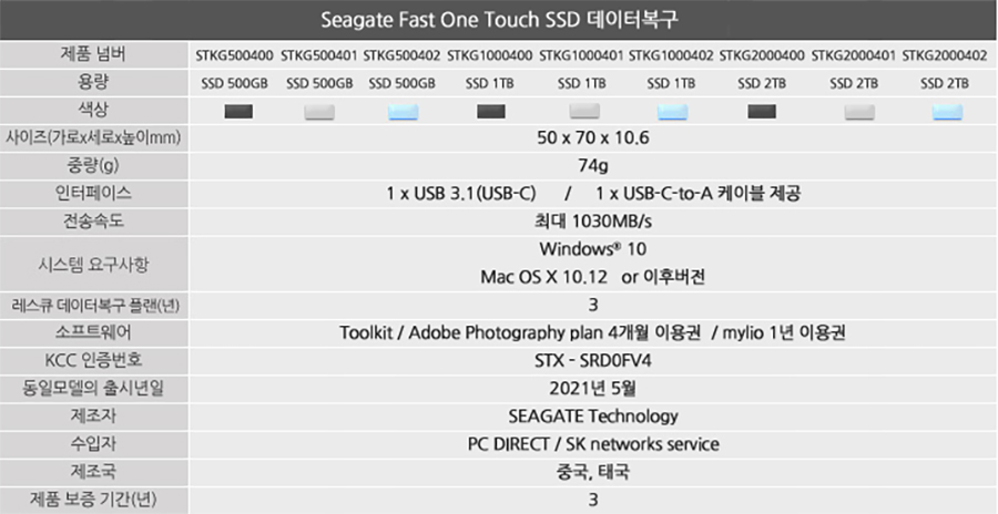 외장 SSD / USB3.1 / PC 연결 USB Type C to A 또는 Type C to C 케이블 지원 / 읽기 속도 1,030MB/s / 크기 가로 50mm X 세로 70mm X 두께 10.6mm / 무게 74g / 보증기간 3년 / 색상: 블랙, 실버, 스카이 블루 / 지원 용량 : 500GB / 1TB / 2TB / 기타 복구 서비스 및 전용 프로그램 툴 킷 지원 등을 확인할 수 있습니다.