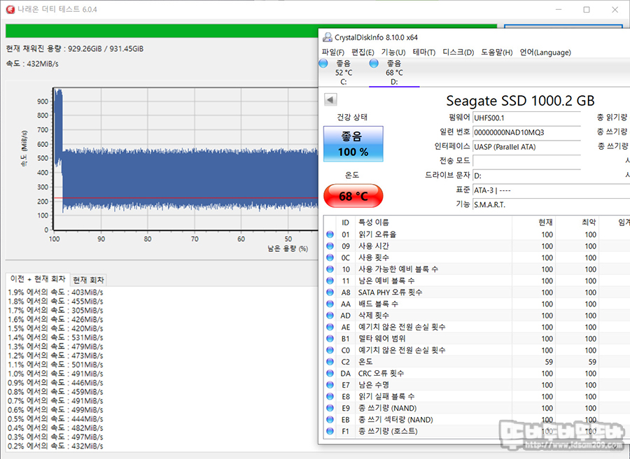 쓰기 테스트가 끝나는 시점에서 온도 체크 시 68도로 외장 SSD 치고는 높지 않은 온도를 보여주고 있는데요.