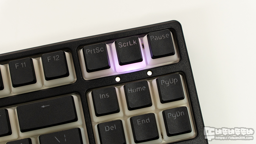 동그라미로 표현되는 LED 인디케이터는 Caps Lock / Win 잠금 상태를 알려주며 Scroll Lock 키 작동은 해당 키 LED가 화이트로 표현되니 참고하시기 바랍니다.