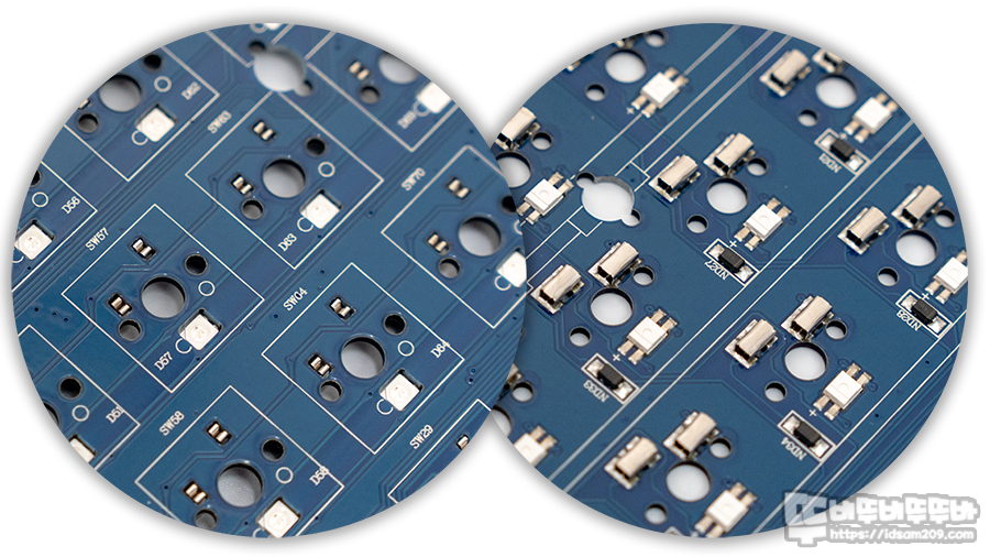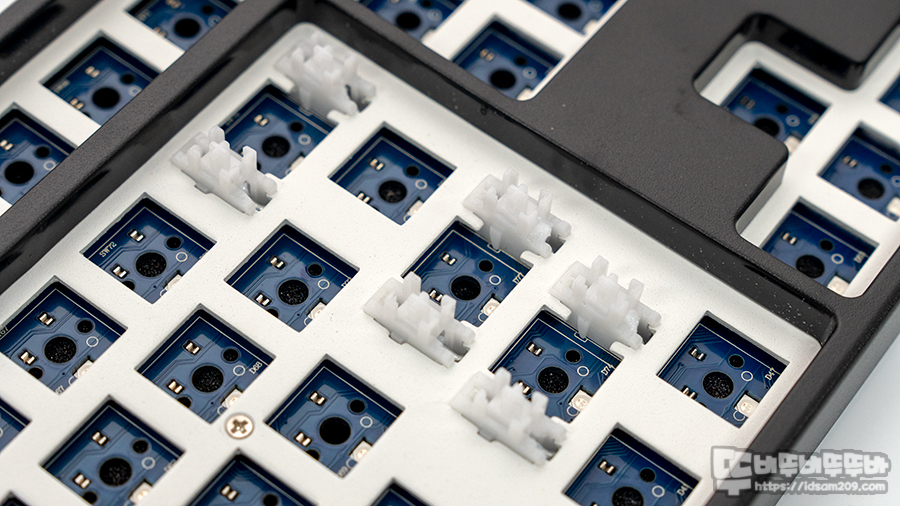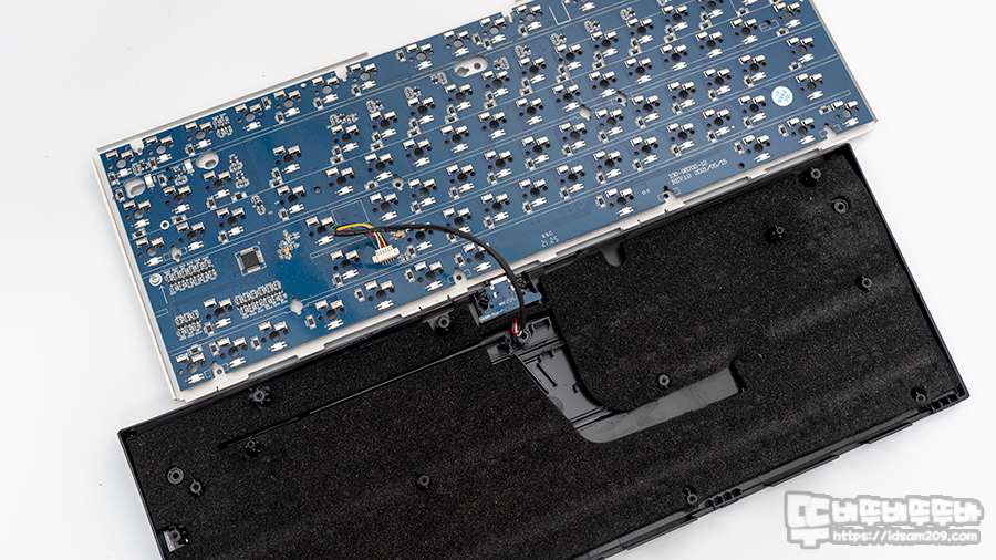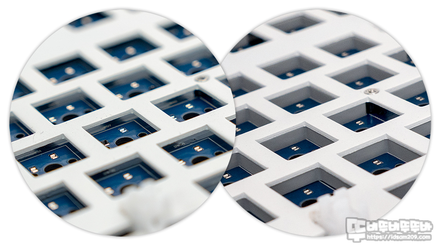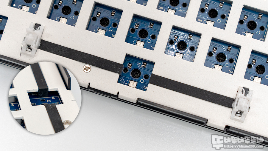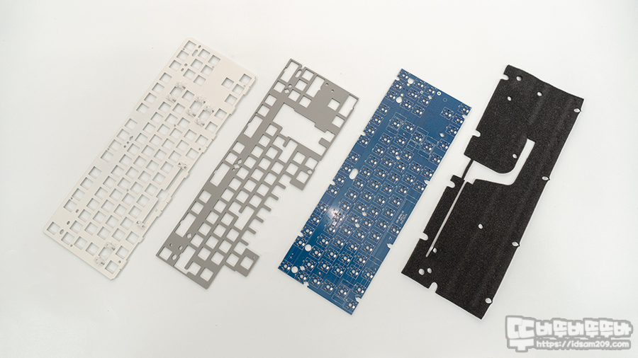 일반적인 키보드들은 보강판과 기판 사이가 비어있는 상태로 출시하는데 이 경우 키보드 내부의 울림이 있게 되어 스위치와 하우징 내부의 울림 등이 복합적으로 발생하게 됩니다.