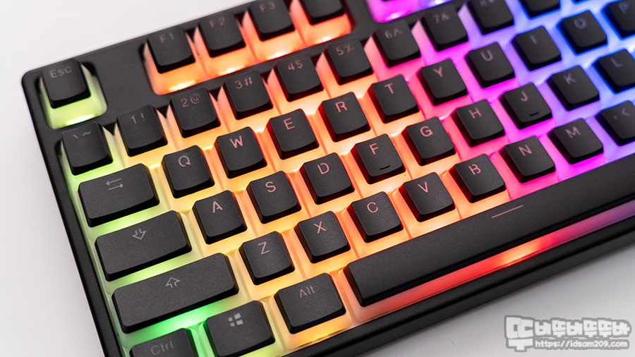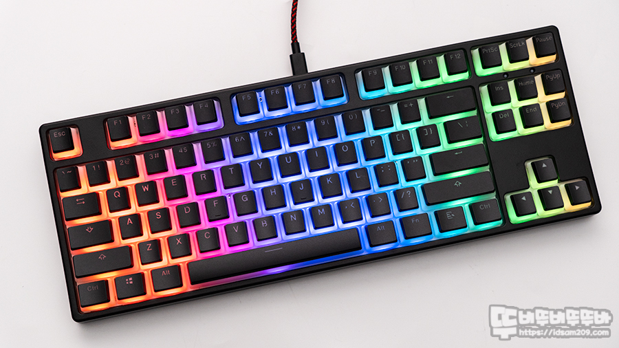 US 표준 87키 배열 / 스위치 교체가 가능한 핫스왑 지원 / 보강판용 체리 스태빌라이저 / N-Key 지원 / RGB LED 효과 / LED 매크로 지원 등을 확인할 수 있네요.