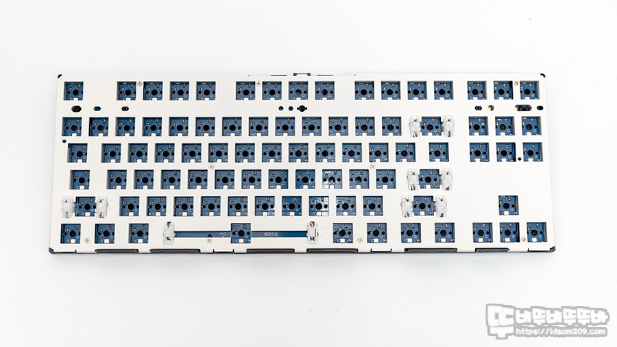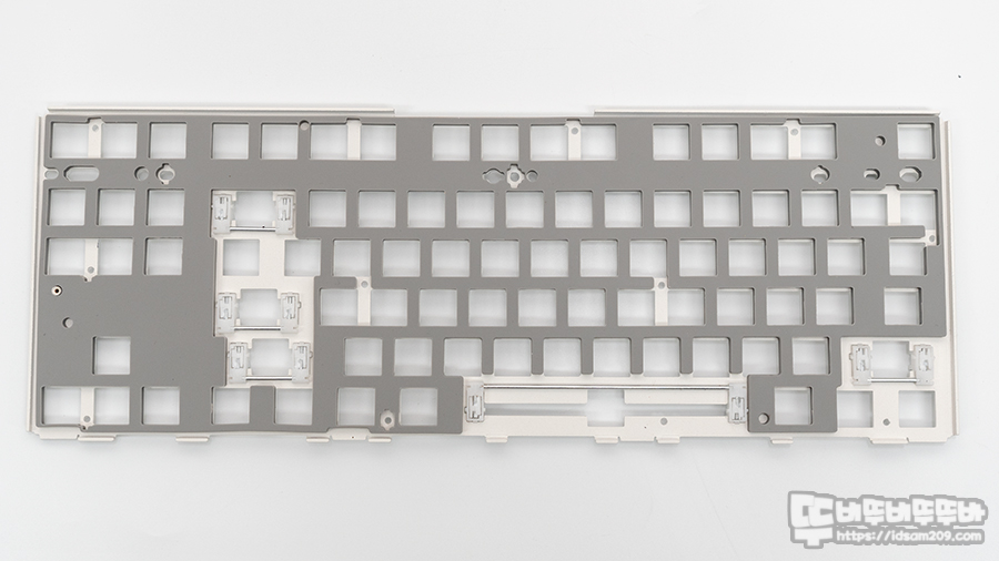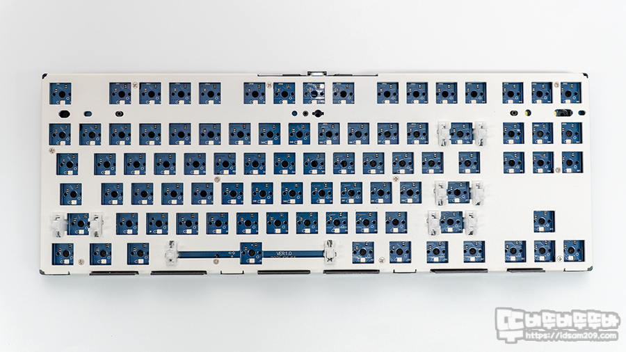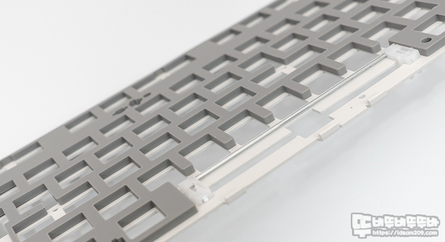 키보드에는 화이트 컬러의 철재 보강판, 보강판용 체리 스태빌라이저가 사용되었으며 기판은 핫스왑 소캣과 SMD 타입의 LED가 부착되어 납땜 없이 스위치를 꼽아서 바로 사용할 수 있게 디자인되었습니다.