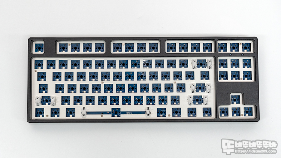 기본적인 몬스타기어 닌자87 RGB 퀵스왑 DIY 커스텀 기계식 키보드는 하우징 상하판 사이에 보강판 - 기판 - 바닥 흡음재로 구성되어 있으며 여기에 차음재를 넣어 재 조립을 진행하겠습니다.